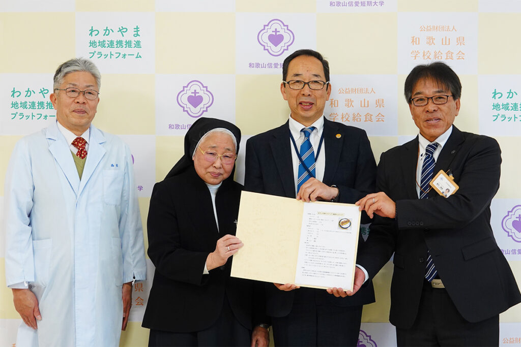 当日は、和歌山信愛短期大学の森田登志子学長、(公財)和歌山県学校給食会の藤田勝範理事長、本プラットフォーム会長の本山貢よりあいさつのあと、開発したメニューのレシピを手交。