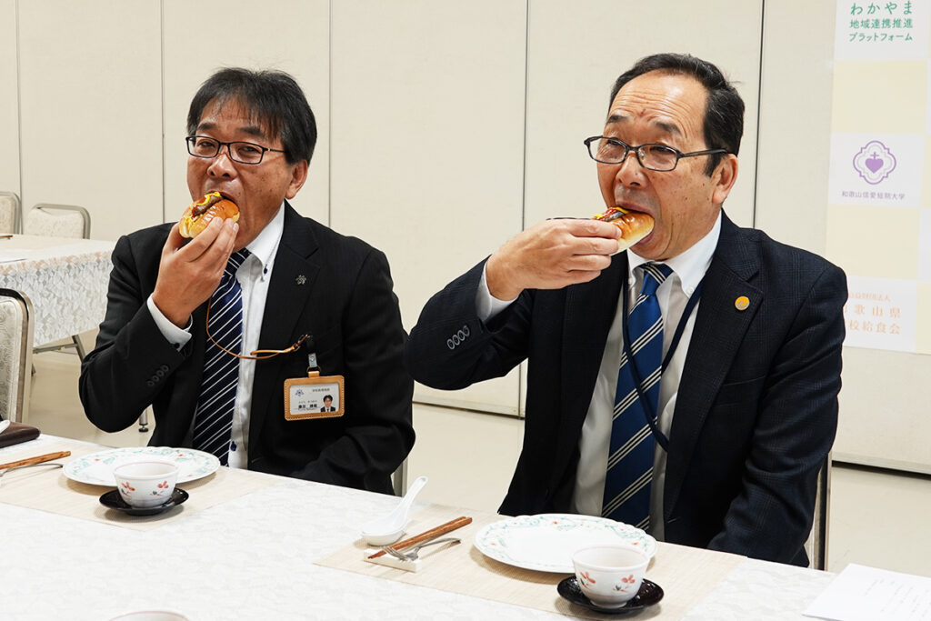新メニューの開発に尽力いただきました西出教授は「学校給食ということで、材料費、和歌山県産の食材、子どもの成長を助ける体に良いものの3点を特に大切に考えました。初めての子でも食べやすいように味つけなどを工夫しています。子どもたちにはさまざまな県産食材を食べることを通じて、広く興味を持ってもらえるようになればうれしいです」と話されていました。